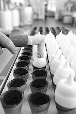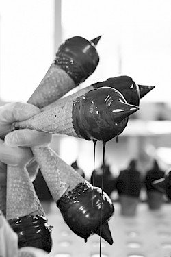 Seit den Fünfzigerjahren wird das Zolli-Cornet in Basel hergestellt. Aus Milch, Kokosfett und natürlichem Vanille. Von Hand abgefüllt und mit einem dünnen Mantel aus Schokolade überzogen wird es sorgfältig in Silberpapier eingewickelt. Unverkennbar: der besondere Zipfel!