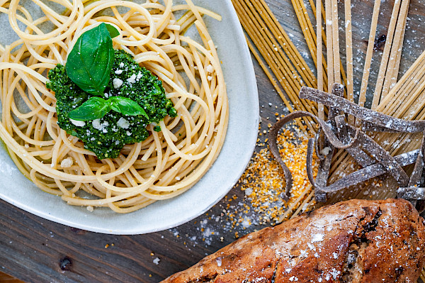 werden nur gesunde und natürliche Zutaten verarbeitet. Die Mehlteige werden mit reinstem Bergquellwasser vermischt, geformt und nach neapoletanischer Methode langsam getrocknet. Verpackt wird die Pasta liebevoll von Hand in das typisch blaue Packpapier. Geniessen - Lächeln - Gut!